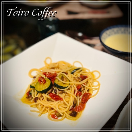 先日ようやく乾燥ポルチーニとドライトマトを使ったパスタを作りました。ちょっと緑の野菜も入れかったのでズッキーニも入れたバージョンで作りました。